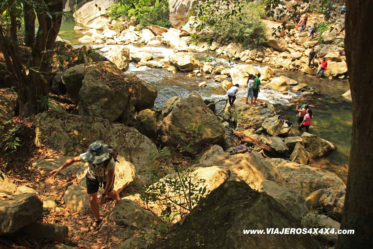 Lo primero que nos sorprendió al aparcar las motos fue que allí no había un solo extranjero. Familias enteras se reunían para un picnic, grupos de amigos se juntaban a tomar cerveza con hielo, hombres, mujeres y niños locales saltaban al agua entre los bloques redondeados por el Nam Hin Bun, el río que surge calmo del interior de la montaña.