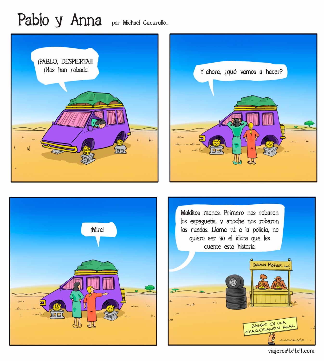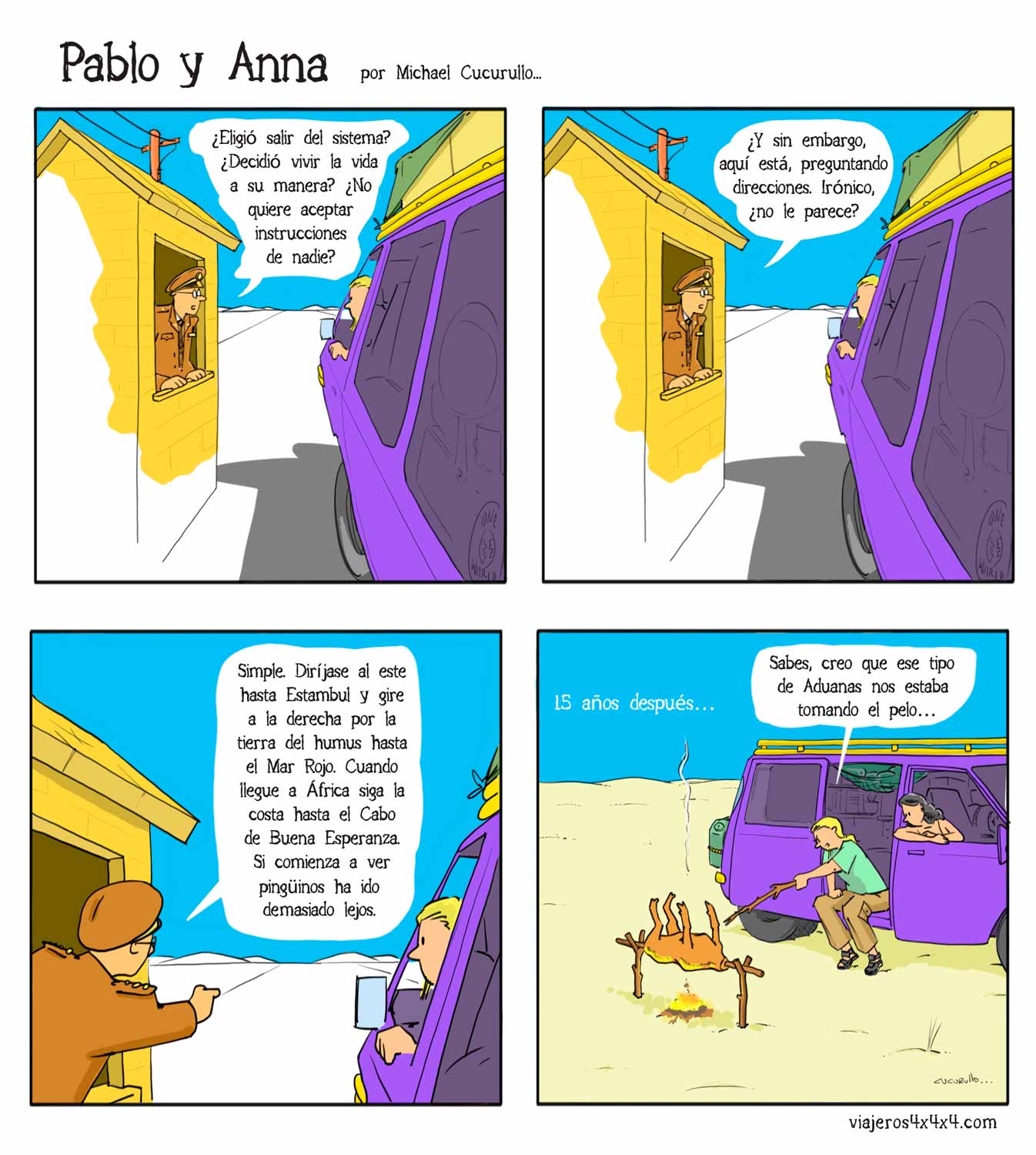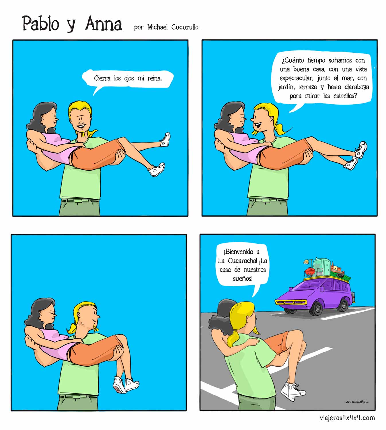 Pablo y Anna, las aventuras y desventuras de una pareja que vive en una casa con ruedas llamada La Cucaracha, tras más de 15 años viajando alrededor de un planeta surrealista llamado Tierra… Sigue leyendo historietas en Pablo y Anna.